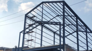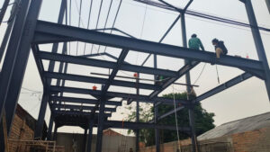 Proyek ini menunjukkan kompetensi kami dalam pekerjaan struktural, di mana kami sedang melakukan pemasangan kerangka baja untuk sebuah bangunan.